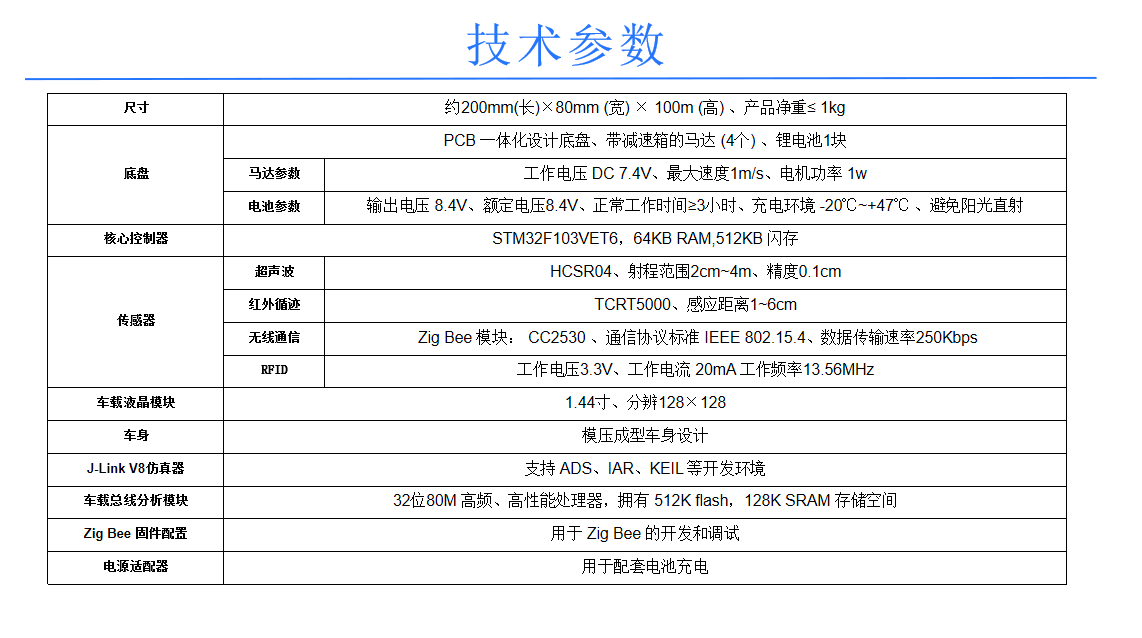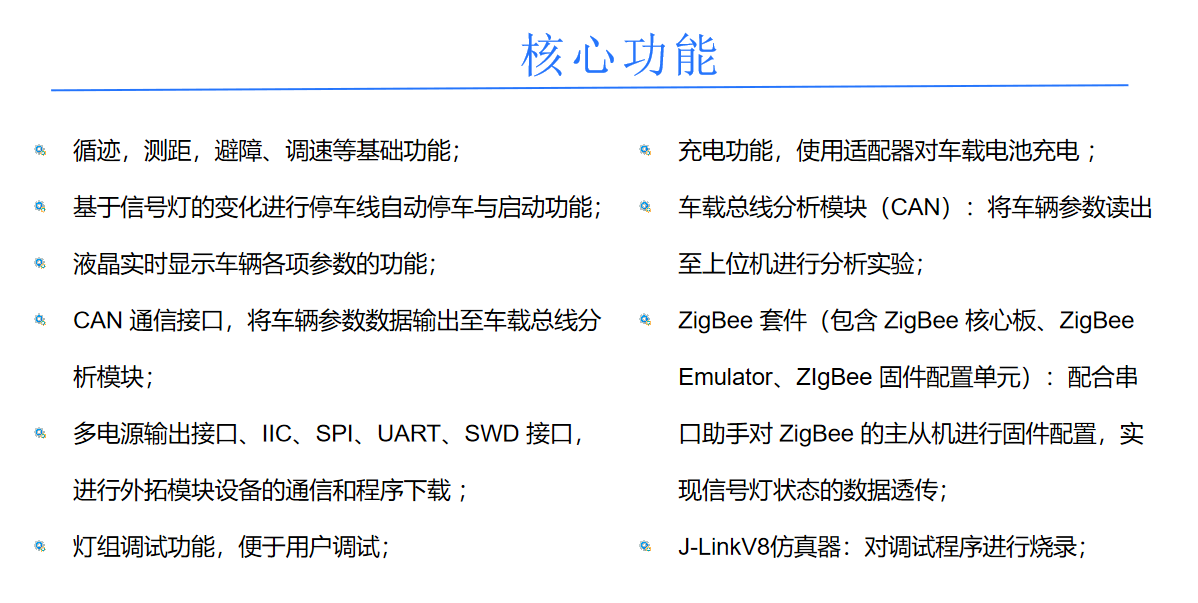 配套课程: 人工智能、智能交通、智能汽车、电子技术相关课程。 应用: 教学演示、学生实验和毕业设计等。